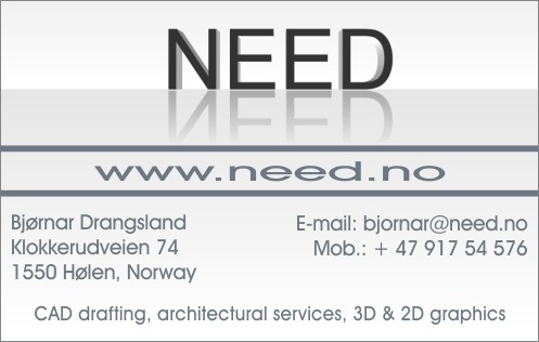 NEED is a company providing CAD drafting, advanced graphics services, IT support and advisory services for architects, interior architects, the real estate business, the cruise business and smaller companies. It is owned and run by Bjørnar Drangsland.